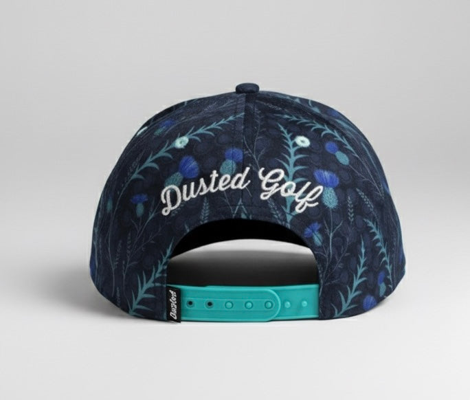 Stand out on the course with the Thistle Crest Snapback from Dusted Golf. Inspired by the rugged beauty of wild thistles, this cap features a deep navy backdrop adorned with intricate thistle-style floral detailing in rich blues and teals.